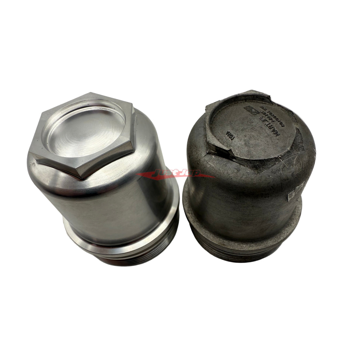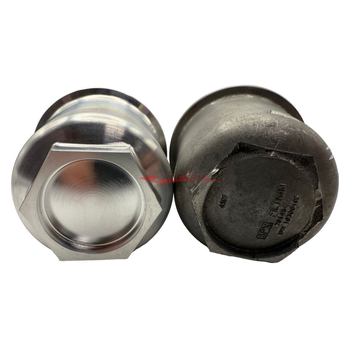The OE original filter cover is easily damaged from being removed & replaced when the transmission is being serviced. The originally fitted factory Nissan fitted "Filtran" line oil filter cartridge, we tend to this item damaged due to over-tightening or found with thread, making the removal a problem. When this occurs, it becomes difficult to remove without breaking the hex, requiring some work to have it removed, leaving it as shown below, and no longer usable.
