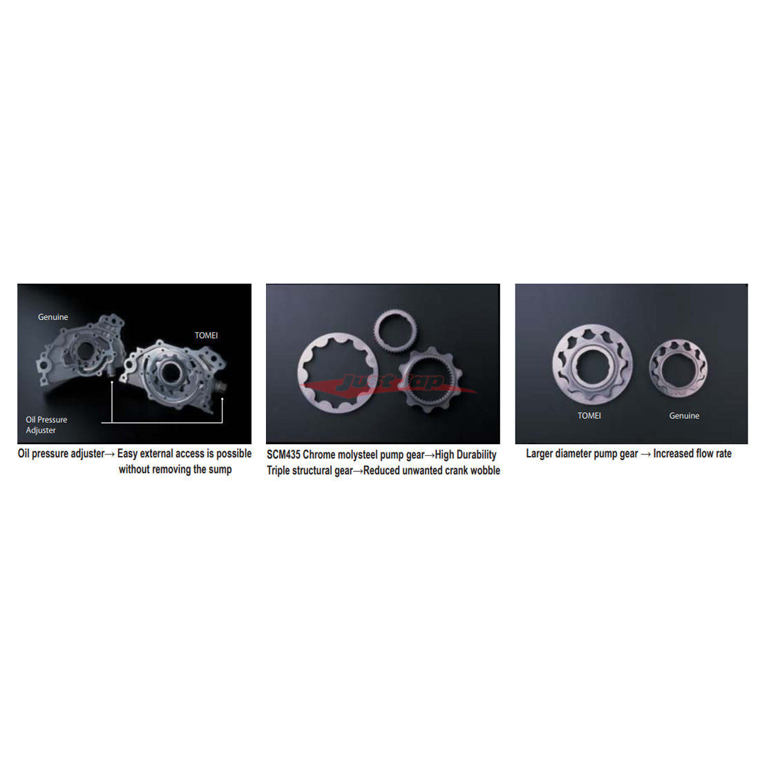The RB26DETT engine is often plagued with oil lubrication issues during circuit and drag racing events which are the main causes of most RB26 engine failures. This problem causes the main bearings to abnormally wear out from the lack of oil pressure. The stock pump is not capable of supplying the adequate amount of oil to maintain the right oil pressures at extreme engine speeds that the high powered monster RB26 performance engines require. Another weak point is that the stock pumps gear is made from weak sintered metal and this often breaks when going for bigger power and higher engine speeds and when this little piece gives out can cause an instant loss of your engine. The TOMEI RB26 oil pump has a larger pump gear made of high strength materials to supply a larger flow rate to the engine and it has an external oil pressure adjuster as well.