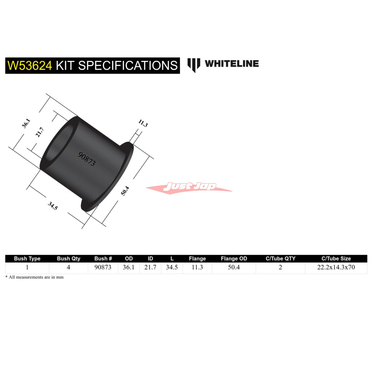 Worn front control arm bushings have a huge influence on vehicle stability, steering precision, and braking efficiency. Replace worn bushings to as-new condition utilising Whiteline's advanced synthetic elastomer bushings with core characteristics ensuring superior elasticity, memory, and outright durability for all forms of driving applications.
