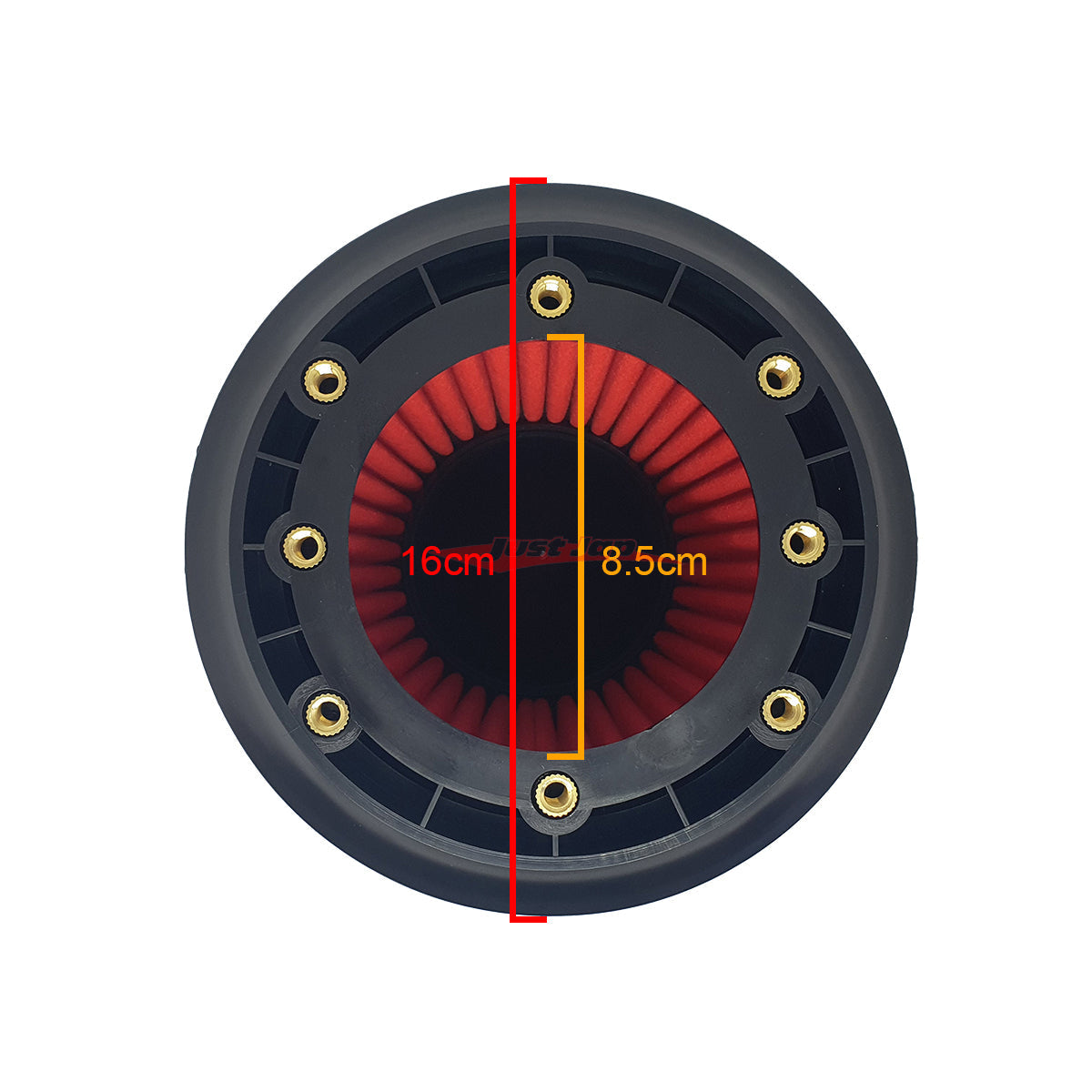 Funnel shapes focused on increasing air speed without changing the flow direction of the intake air. The result is a high speed and smooth flow of air into the intake. The lower funnel has been engineered at a 14-degree curve for maximum efficiency. Also, the lower funnel position has been made even closer to the base of the cleaner to reduce drag and eliminate any _dead spots within the cleaner.