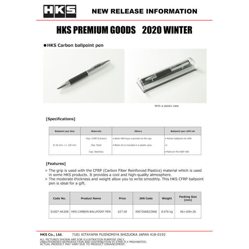 The grip is used with the CFRP (Carbon Fiber Reinforced Plastics) material which is used in some HKS products. It provides a cool and high-quality atmosphere. The moderate thickness and weight allow you to write smoothly. This HKS CFRP ballpoint pen is ideal for a gift.