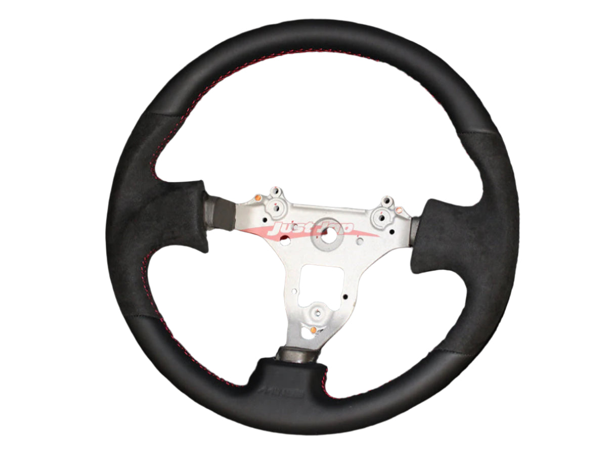 Mine's R34 GT-R Original Racing Steering Wheel is made of a combination of the highest quality leather and Alcantara leather. The grips top and bottom are composed of Nappa Leather, leather used in many of European Luxury cars.